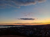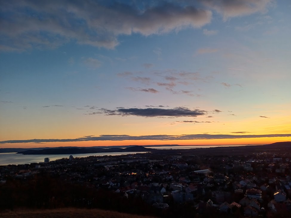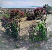 Rálátás a Balatonra: K-en az akarattyai magas-parttól, Ny felé átlátva a Tihanyi félsziget felett a Balaton nyugati medencéjébe.