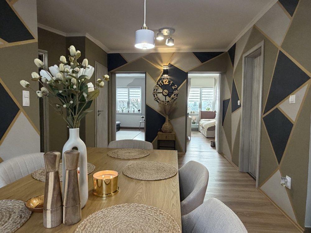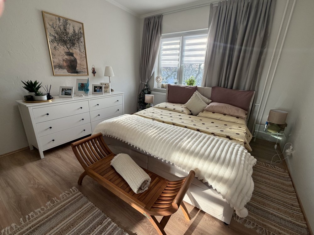 Tágas előszoba, nappali, világos konyha–étkező, egy nagyméretű hálószoba, zuhanyzós fürdőszoba és külön WC.